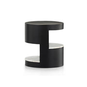 Dark bronzed iron forms a drum-style end table with cutout shelving of creamy taupe marble for contrast.