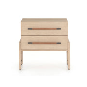 Light-finished oak forms a clean silhouette for dual drawers with iron hardware wrapped in tan top-grain leather.
