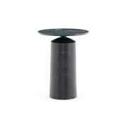Sculptural intrigue. A dramatically scaled, pedestal-style nightstand features a shapely bronze-finished aluminum base and rounded tabletop of hunter green marble.