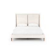 Light, livable luxury. Upholstered in a cream linen-blend, a tapered headboard features fixed overscale pillows, for a calming look with great depth. Wire-brushed parawood legs lend a warm, natural finishing touch.