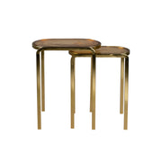 Our Bandhu is the ultimate nesting table set. Bandhu comes in a set of two and boasts a very sturdy and high-quality metal frame. The brass finish is responsible for the style factor, while the glass tabletop takes care of the wow factor. The glass tabletop is cast into shape and made out of leftover glass from bottle and glass industries. We tinted the glass a stable amber colour, but every cast of the thick tabletop can turn out slightly different, thereby adding to the overall design that we so love.
