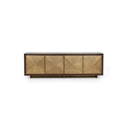 The sideboard goes glam. Faceted front panels are brass-clad for eye-catching allure, as dark walnut framework delivers warmth to a contemporary-cool style. Planked legs of brass-finished steel up the trend-forwardness of this statement storage piece.