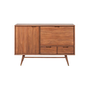 The Ralph side board is notable for a refined early-modern aesthetic inspired by classic mid-century design. Constructed to accommodate a variety of dining accessories the Ralph is fitted with soft close hardware, an interior silverware drawer, and elegant turned wood legs featuring brass leg caps. The Ralph is constructed using solid American Poplar hardwood stained Walnut.