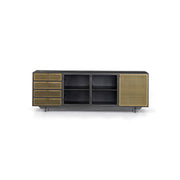 A texture-rich take on streamlined shaping. Mid-century form undergoes a modern refresh via cutting-edge materials and trend-forward finishes. Angular iron framing welcomes drawer fronts and cabinetry of perforated brass, as ring-style hardware add a unique finishing touch.