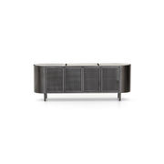 Late-Seventies style gets a modern refresh. Gunmetal-finished iron is perforated and rounded, for an intriguing take on popular pill shaping. A polished white triptych-style marble top adds material interest to this unique piece.
