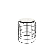 Trad is a versatile indoor-outdoor side table with a white terrazzo top with little pops of color and a black powder boated cage like base. A stand alone piece that helps tie any space together.