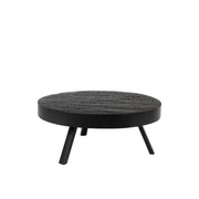 Suri est une table basse élégante et simplement fabriquée en bois de teck laqué noir. Son gros plateau rond est soutenu par un trépied évasé. Polyvalente, durable et fonctionnelle : achetez-la comme table basse simple ou comme ensemble complet de trois.