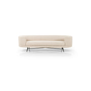 L'élégance prend forme. Impeccablement recouvert d'un tissu de couleur ambre unique et cool, la forme douce des pilules témoigne de la grande inspiration parisienne derrière ce canapé unique, avec des civières à base croisée et des pieds évasés en acier inoxydable noir.