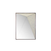 Deux sections triangulaires de verre sépia antique complètent l'intrigue de ce miroir géocentrique, encadré par de l'acier inoxydable fini bronze.