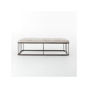 Une nouvelle version de l'ottoman intrigue avec un capitonné en diamant spectaculaire, des coins en angle et une base en fer ouverte. Il peut également servir de table basse.