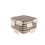 Le pouf Trail apporte un charme bohème aux maisons contemporaines ; ses pompons et pompons en laine se combinent avec des bandes à motifs géométriques tribaux pour un look chic et global. Le coloris gris foncé et ivoire est parfait comme décoration polyvalente, qu'il soit utilisé comme siège supplémentaire, comme repose-pieds ou comme table d'appoint avec un plateau perché sur le dessus.