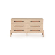 Le chêne au fini clair forme une silhouette épurée pour six tiroirs spacieux dotés d'une quincaillerie en fer enveloppée de cuir de grain supérieur beige.