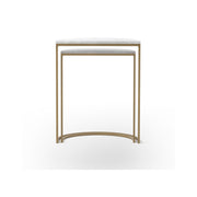Du style avec un côté pratique. De minces pieds en fer au fini laiton soutiennent des plateaux de table en demi-cercle en marbre blanc classique. La fonction d'emboîtement offre une surface supplémentaire pratique lorsque cela est nécessaire, se rangeant facilement lorsque ce n'est pas le cas.