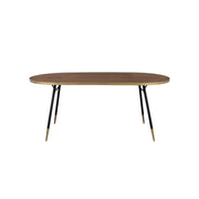 Table à manger extrêmement élégante et légère de la marque White Label Living. DENISE a un plateau ovale en MDF avec placage en bois de frêne de couleur noyer, terminé par un bord en fer doré, qui constitue un bel accent et crée une ambiance élégante. Grâce à ses pieds noirs, fins et obliques, la table semble légère et n'envahit aucun intérieur.
