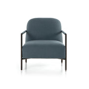 Upholstered in a soft, wool-like fabric in a modern slate blue, an airy iron frame strikes balance in this mid-century-inspired arm chair made from 90% post-consumer recycled materials.