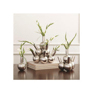 Nickel four-bottle vase to fill with flowers or display empty down the center of a table or mantle.