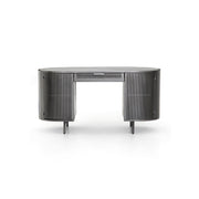 Late-Seventies style, refreshed for the modern office. Gunmetal-finished iron is perforated and rounded for an intriguing take on popular pill shaping, while a top of polished white marble makes for a unique material mix-in.