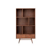 A room divider, entertainment bar or display shelving, the stylish, space saving, Mario large bookcase is a contemporary expression of mid century modernism. Featuring 3 tier display shelving, with 2 lower drawers resting delicately on brass capped turned wooden legs, the Mario is constructed using solid American Poplar, stained walnut brown.