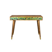 It is plain to see that a lot of love went in the drawers of this Meena console table. That’s because those peacock-inspired eyes are handmade. First a brass foil is hammered over the wooden pattern. Next step is lacquering by hand, colour by colour. The result transforms this good-looking console table into an amazing pièce de résistance.