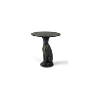 Panther side table. Black painted resin base with black glass table top. Gold aluminum necklace with logo.