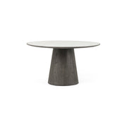 Mixed materials make for great drama. A cone-tapered base of dark, weathered oak supports a rounded tabletop of white-finished solid marble, with oak banding on the edges for thoughtful contrast